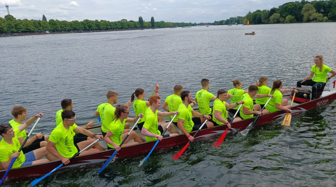 Nachdem sich die beiden Teams zusammengefunden hatten, gab es zunächst zwei Trainingseinheiten, bei denen sich die Studierenden untereinander kennenlernen konnten und in die Welt des Paddelns eingeführt wurden. Ein Großteil der Studierenden saß dabei zum ersten Mal in einem Drachenboot. Um möglichst schnell voran zu kommen, sind wohl Kraft, aber auch eine gute Zusammenarbeit im Team gefragt, da alle im selben Takt paddeln müssen und jeder auf seinen Vordermann achten muss. Zwei Eigenschaften, die die Studierenden ohne Probleme erfüllten.